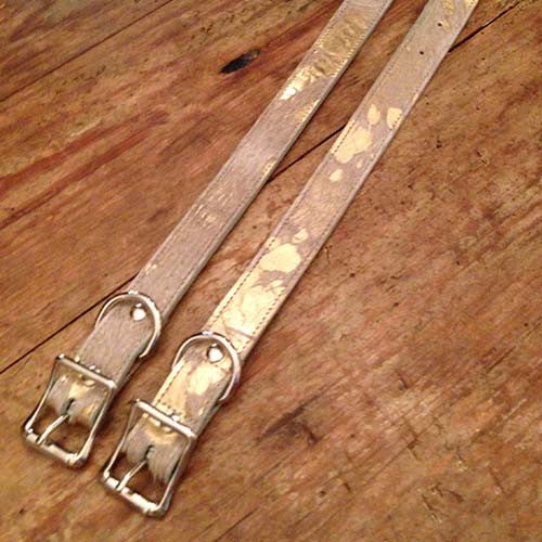 American Cowhide Dog Collars Acid Dyed Neutrals gold and silver details.