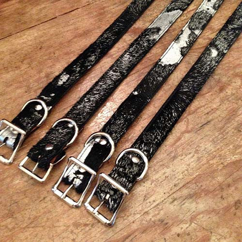 Our stack that is shown is a perfect example of adorned collars. American Cowhide Dog Collars are each one-of-a-kind and uniquely beautiful. The cowhides are individually acid washed and dyed by hand, in his case black with gold, creating unique and varied effects, which makes each dog collar one-of-a-kind. You might want a collar adorned with Pearls or Gator Teeth that are capped in either gold or silver. When customizing your collar there are many combinations to be had, we offer help while making your choice.
